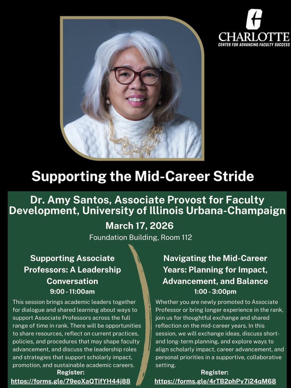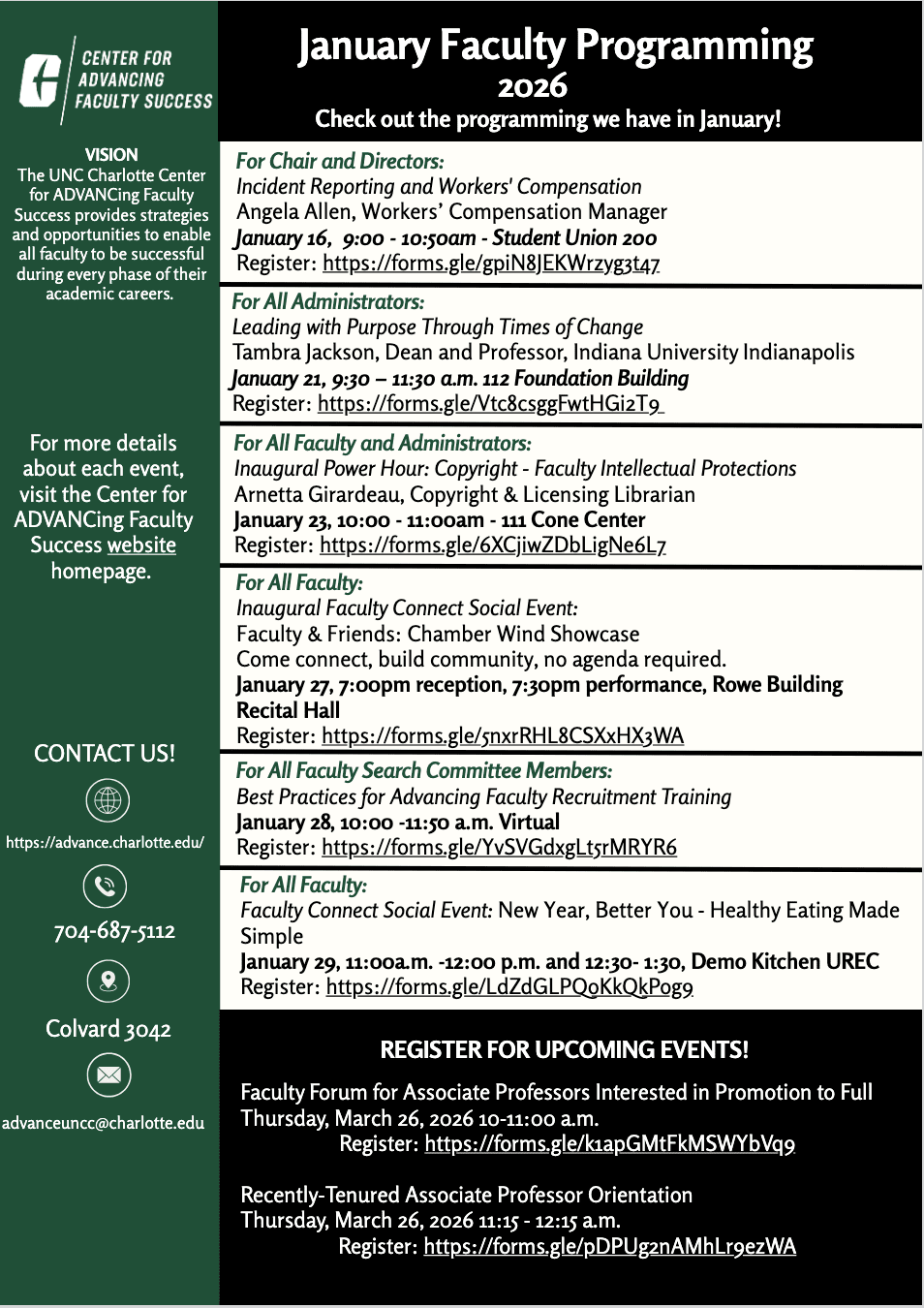 Welcome to the Events page for The Center for ADVANCing Faculty Success (CAFS) at UNC Charlotte! Our mission is to empower faculty through a dynamic range of professional development opportunities designed to foster growth, collaboration, and innovation. Whether you’re looking to enhance your teaching strategies, engage in cutting-edge research, or build meaningful connections with peers, our events are tailored to support your academic journey. From workshops and seminars to networking opportunities and leadership programs, each event is carefully crafted to address the unique challenges and aspirations of faculty at all stages of their careers. Join us as we work together to create a vibrant, inclusive, and forward-thinking academic community.