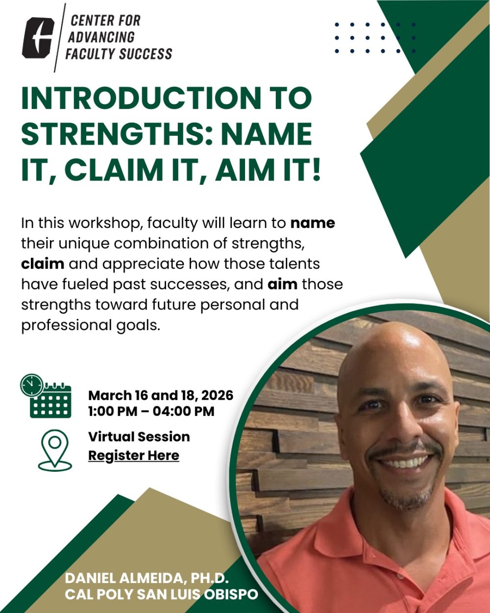 Click here then click on the links to register for any of The Center for ADVANCing Faculty Success upcoming programming detailed below